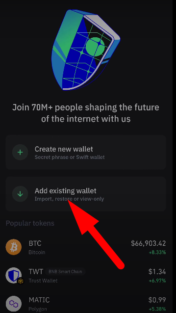 Since you already have a Trust Wallet account, select the “Add Existing Wallet” option instead of creating a new one. This will allow you to log in using your existing credentials.