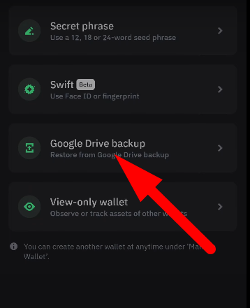Depending on the backup method you used when creating your Trust Wallet account, choose the appropriate option. If you backed up your wallet using Google Drive, select this option.