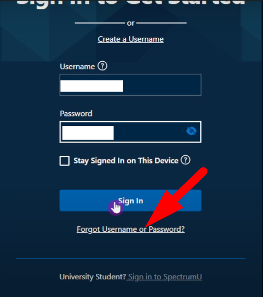Username: Enter your Spectrum TV username. Your username could be your phone number or email address or anything you created. You can choose Forgot Username or Password if you are unable to recall this information.